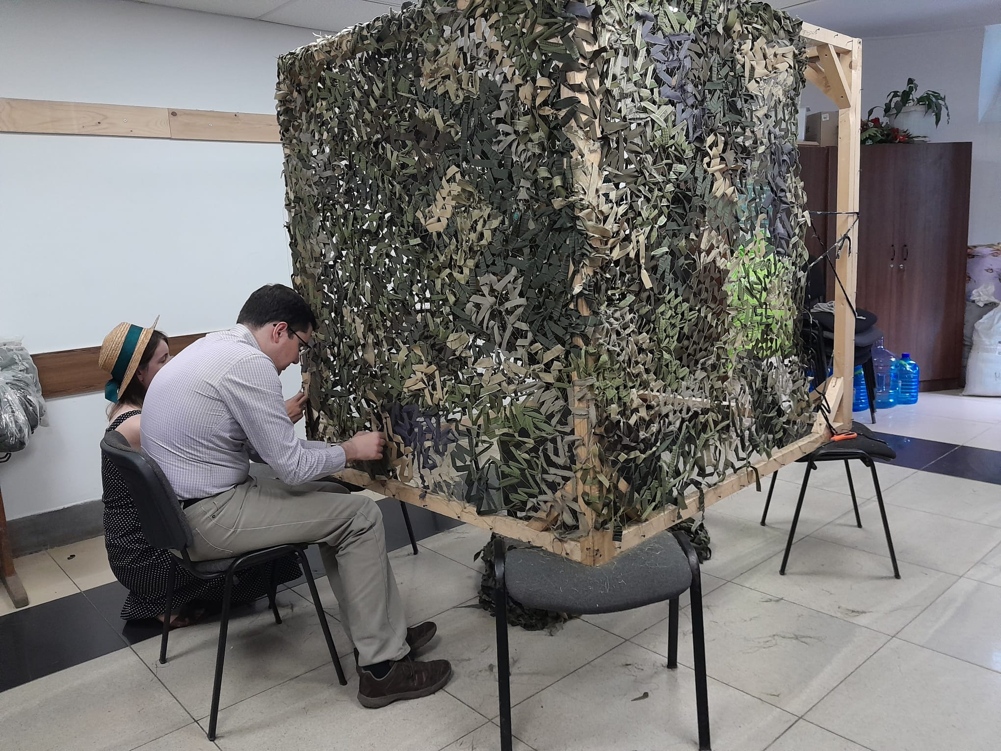 I even made a camouflage net – something I never thought I would make. But as it is crucially important for the soldiers at the frontlines for their suvival, you simply do make camouflage as a volunteer. A net of a stable thread is nailed to a frame and on that net you weave an irregular pattern with green remnants. Each of us has their own technique, I went with my gut. Seemed to be going well as Nataliya, the „boss“, was quite pleased with my work. 😉 I liked doing the camouflage, it is meditative and somehow art. While peeling vegetables and putting together the meals aren’t connected to the war that obviously, this was different with the camouflage – I happily would have skipped this experience. Despite all the chatting and laughing that comes with the work and some language obstacles with our English-Ukrainian mixture, we all knew why we are here. The war lies like a shadow over everything we do.