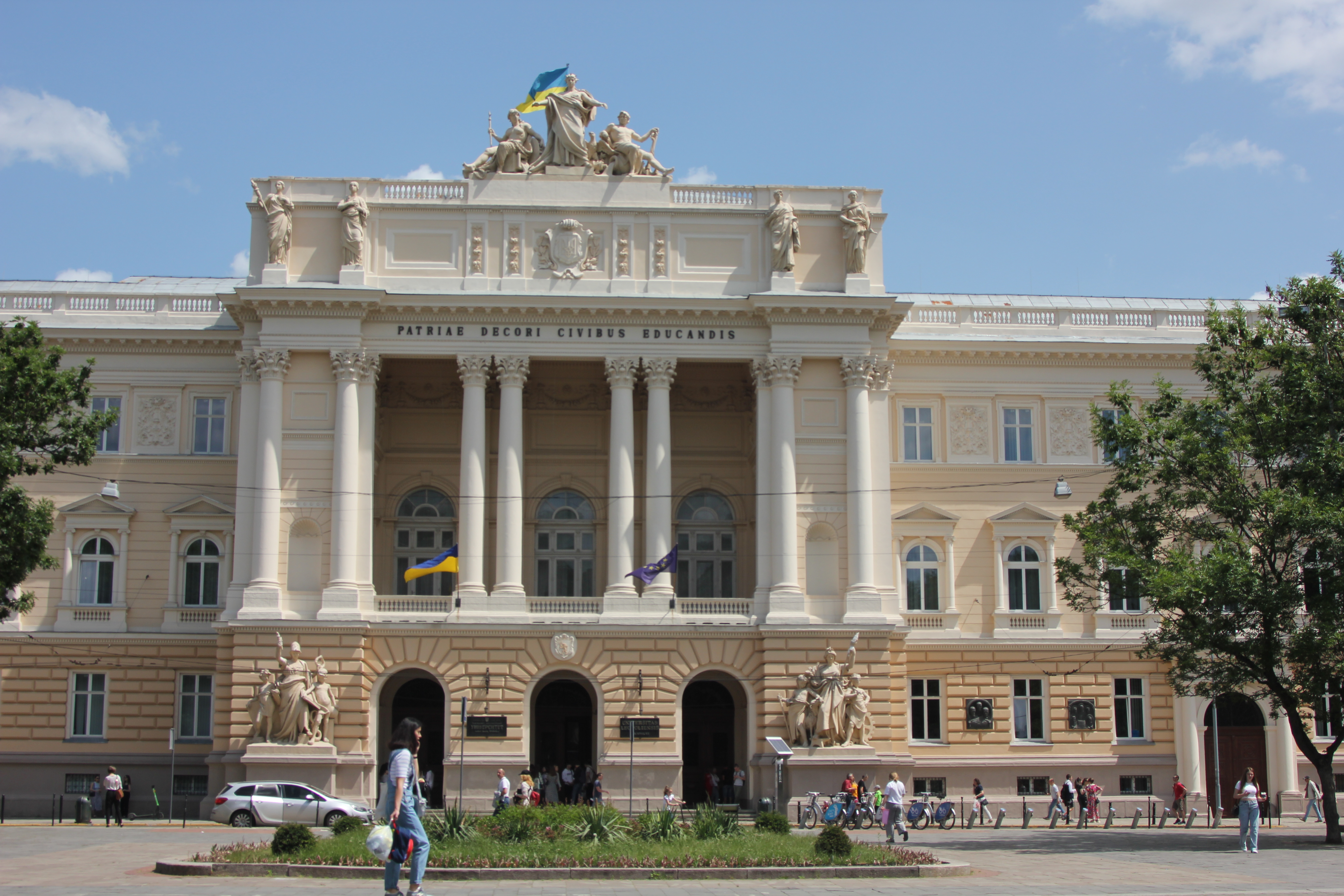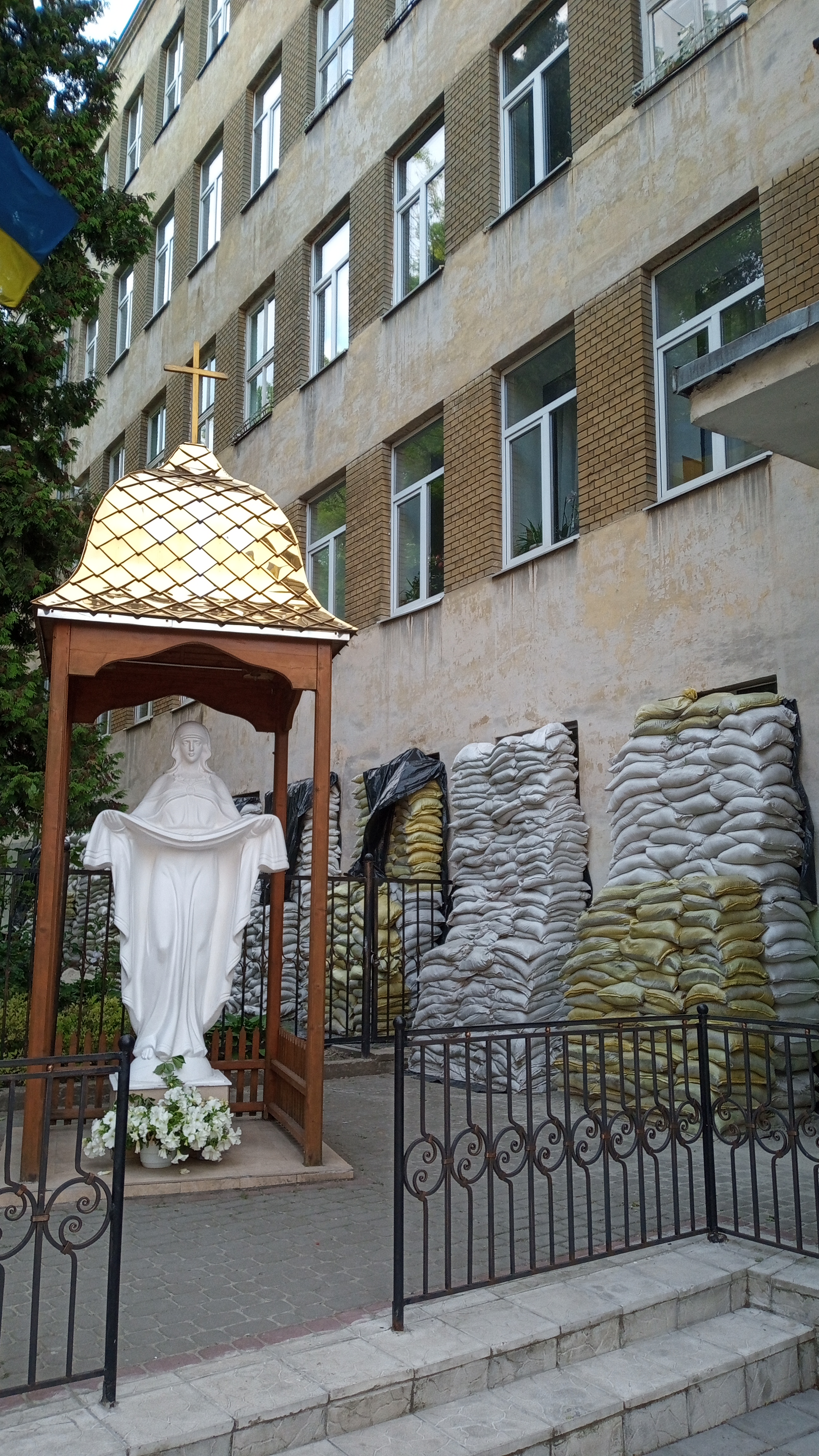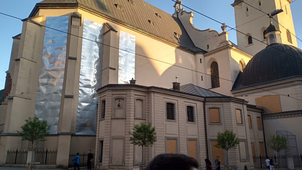 Unfortunately the war is present everywhere in Lviv, the vitality of the city can’t really blur the presence of it. First of all you are reminded that you are in a country at war by the regular air raid alerts, mostly deep at night. Soldiers are everywhere in the city, many buildings are protected with sand bags. The precious windows at churches are covered with metal, statues are protected, too. Most exhibits in museums are not on display, or only copies of them, as they are stored at save places.